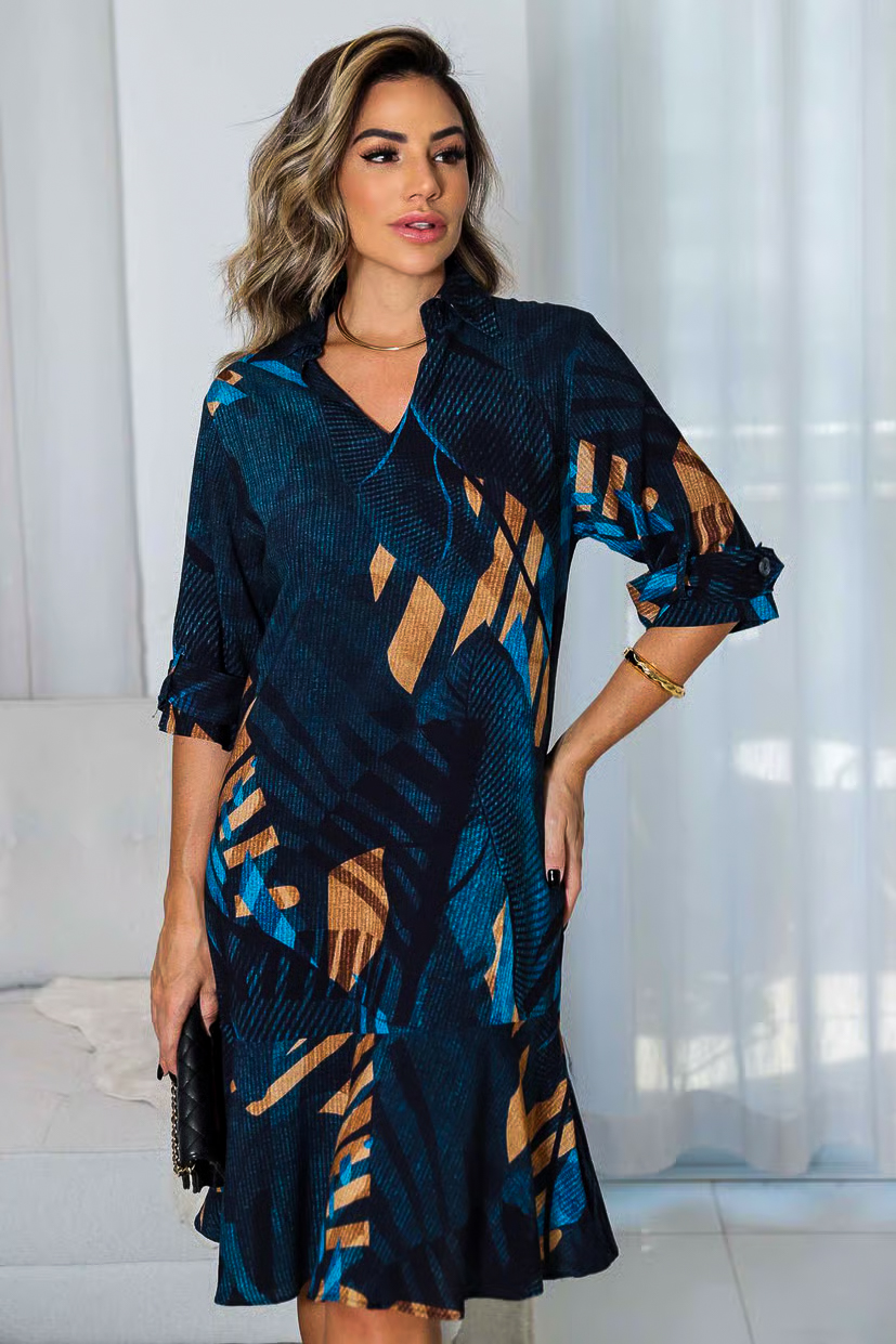 Vestido viscose com gola e babado AZUL