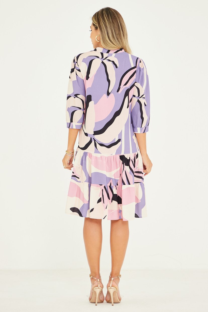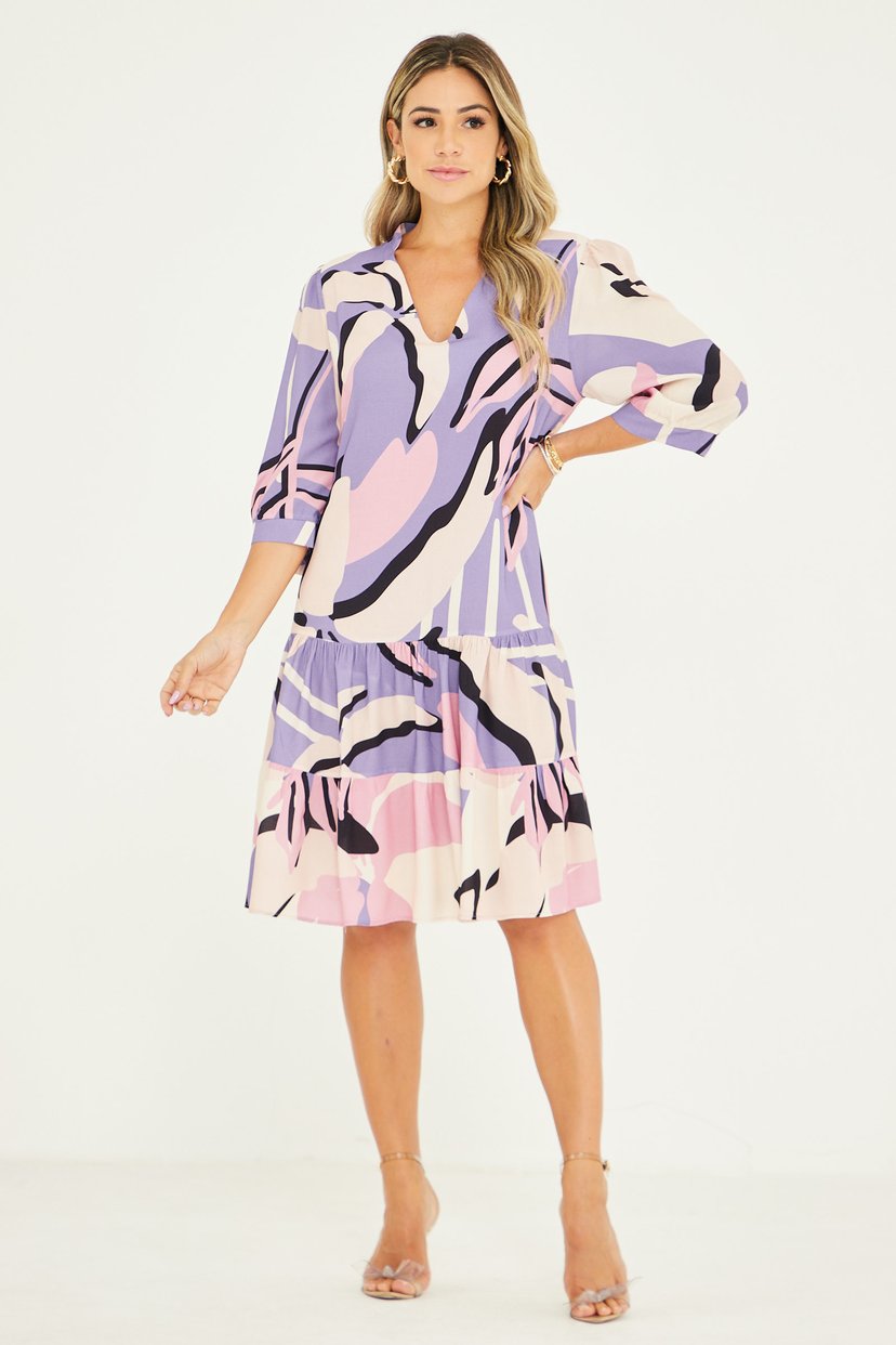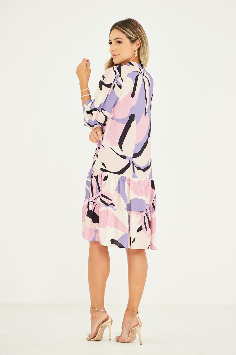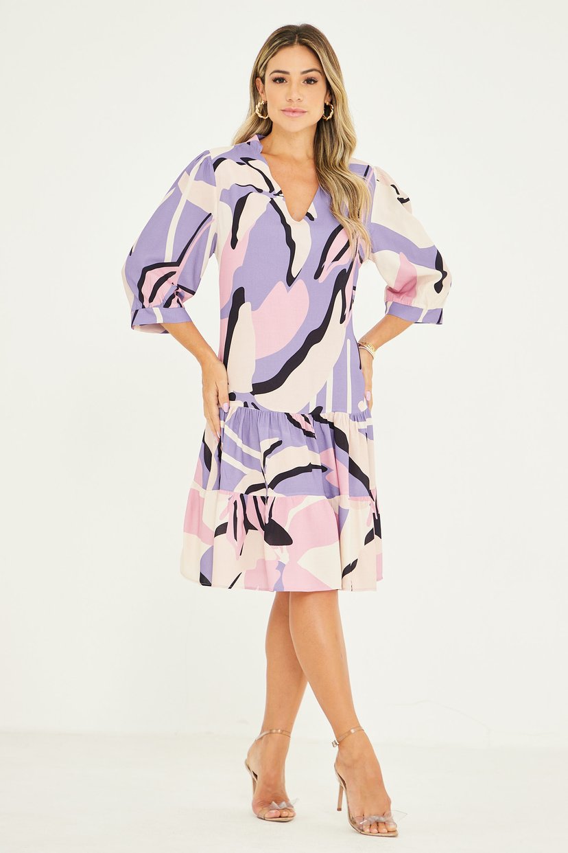• Vestido com decote em V, manga 7/8 bufante e babados na saia
