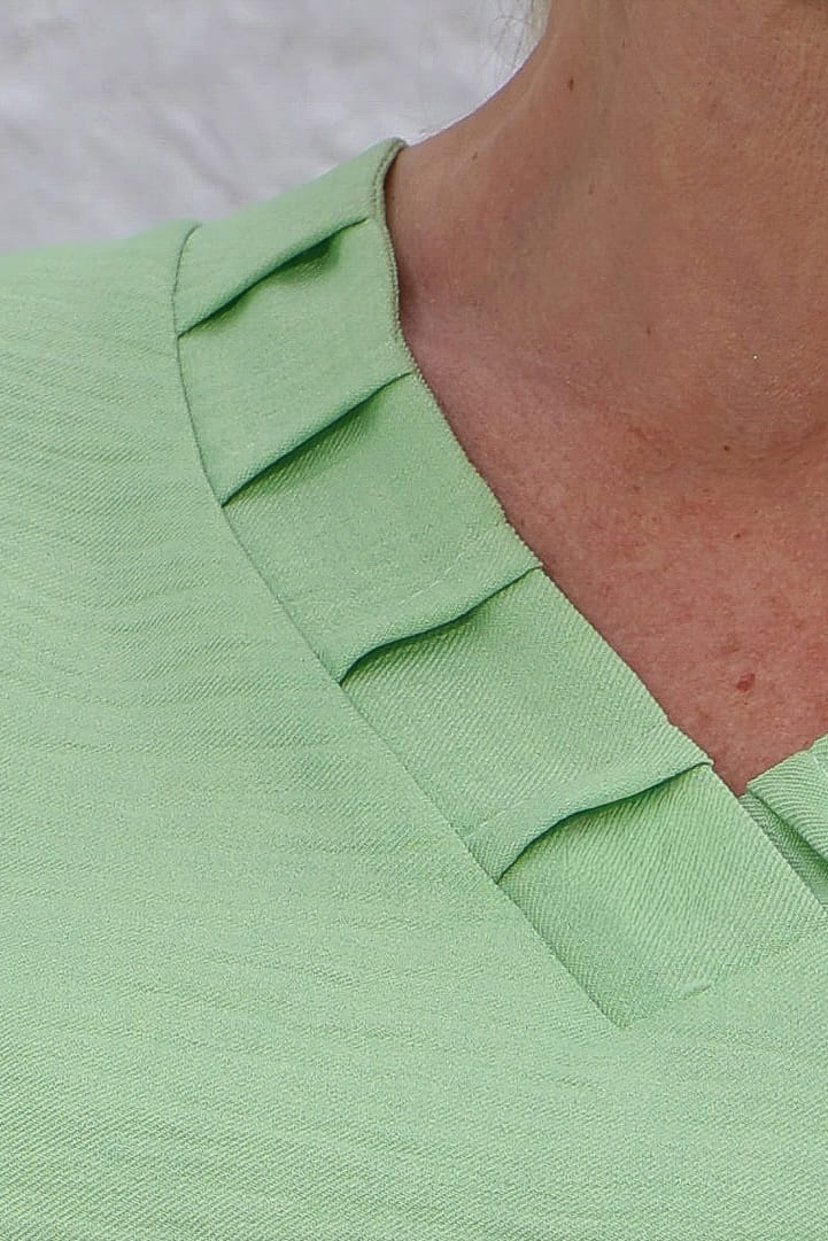 • Detalhes no decote da blusa que trazem charme;