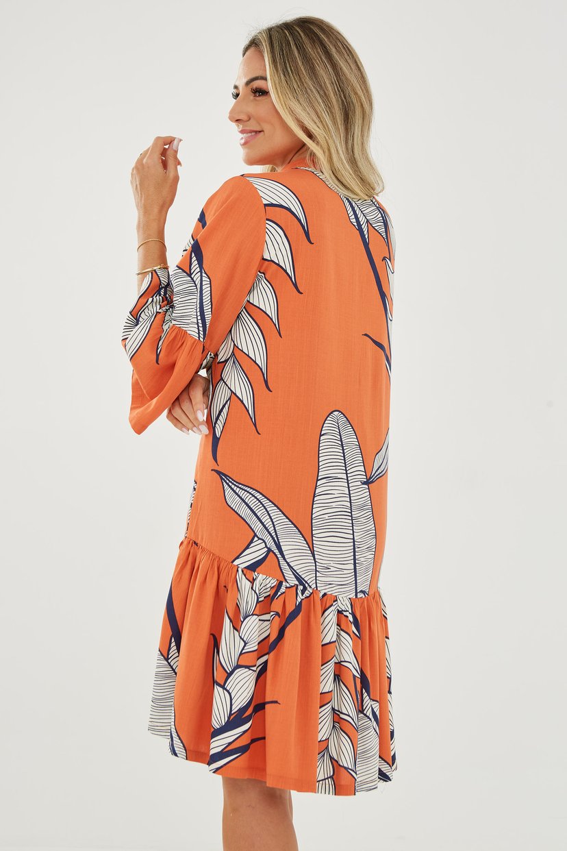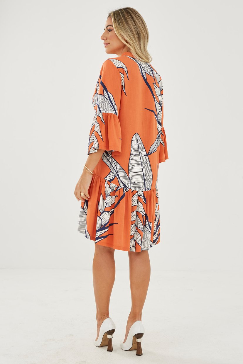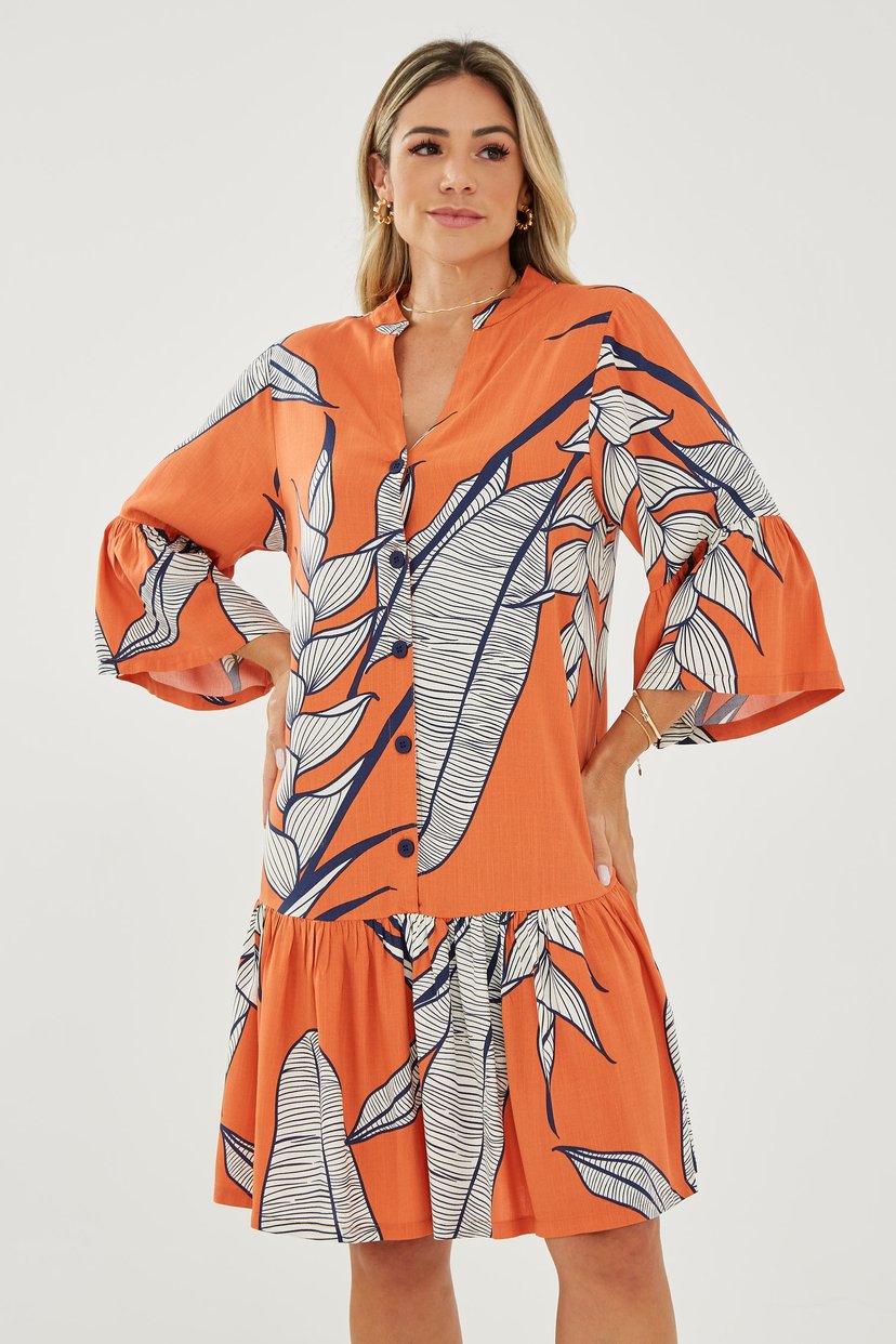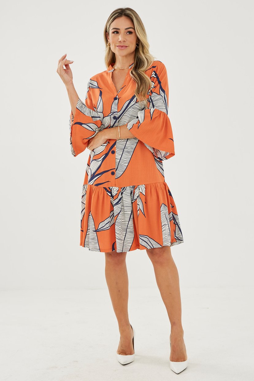 • Vestido em gola V, manga 7/8 flare, babados na barra, fechamento frontal com botões