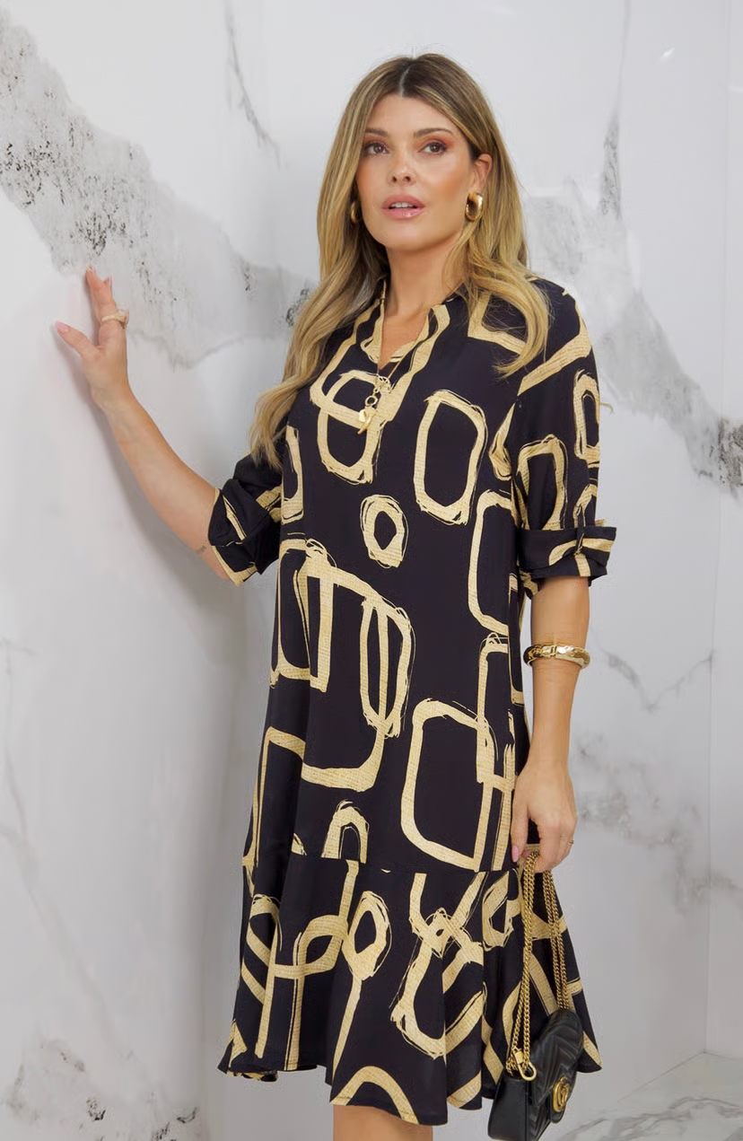 Vestido Sobreposição Manga Longa AZUL GEOMETRICO