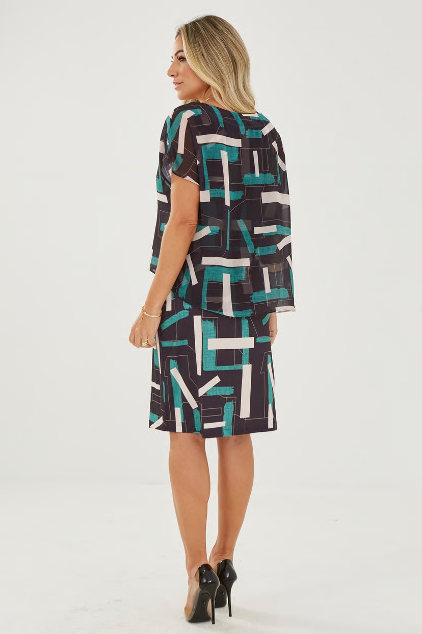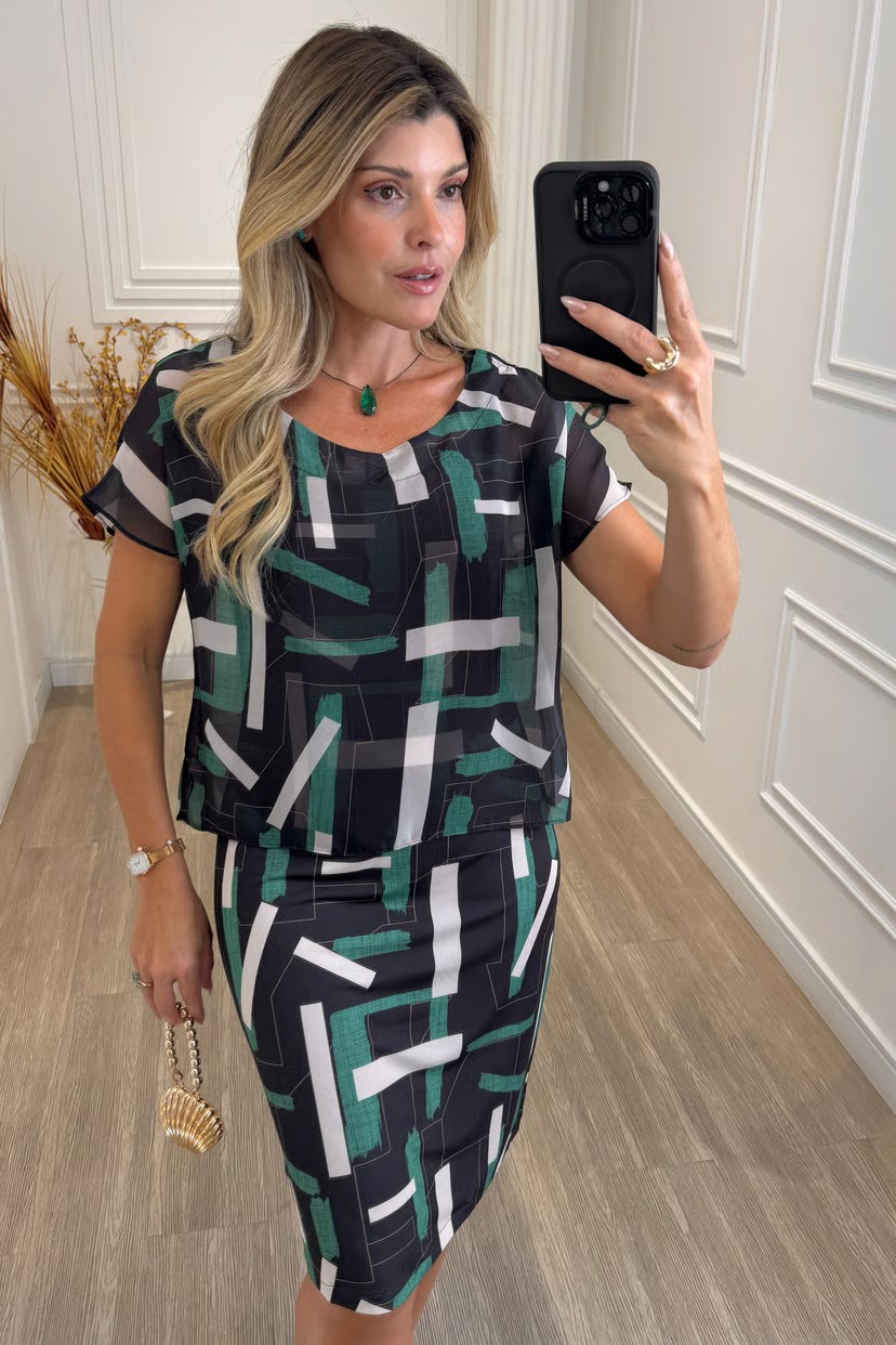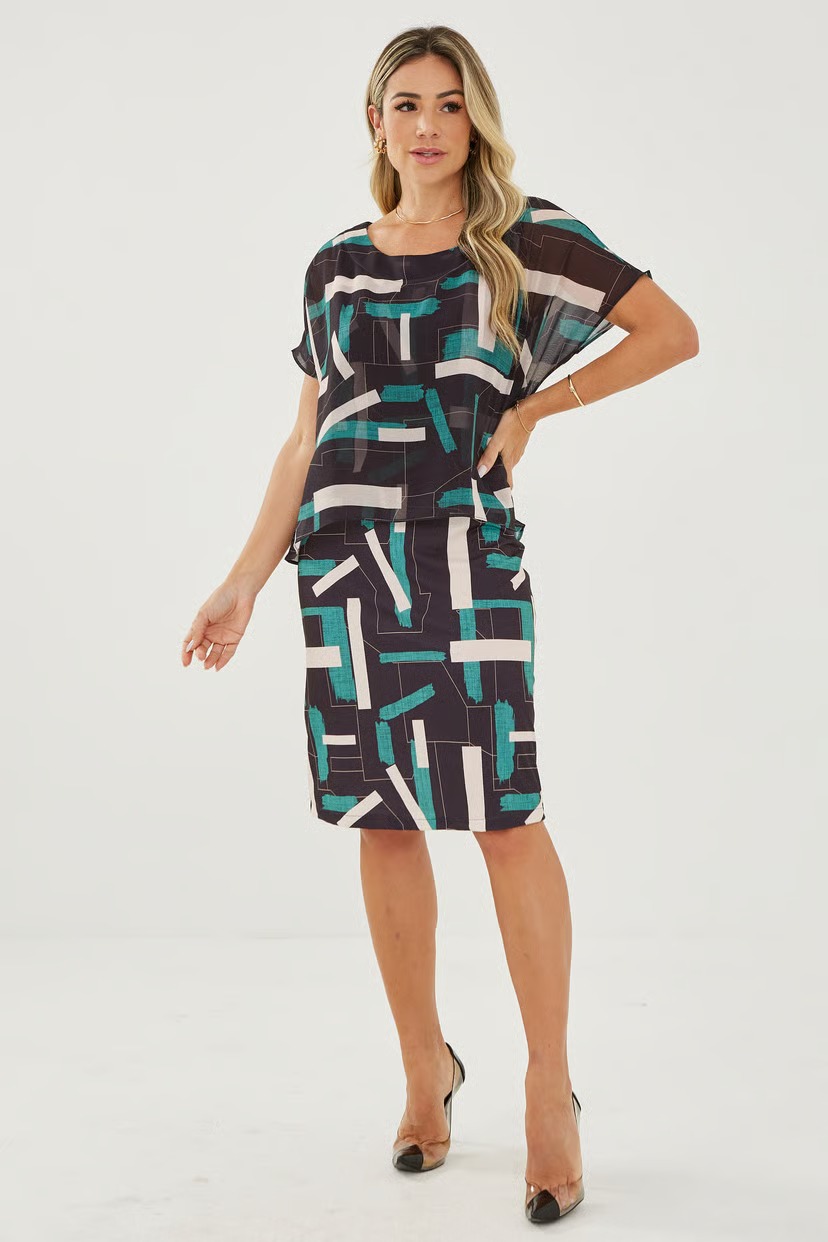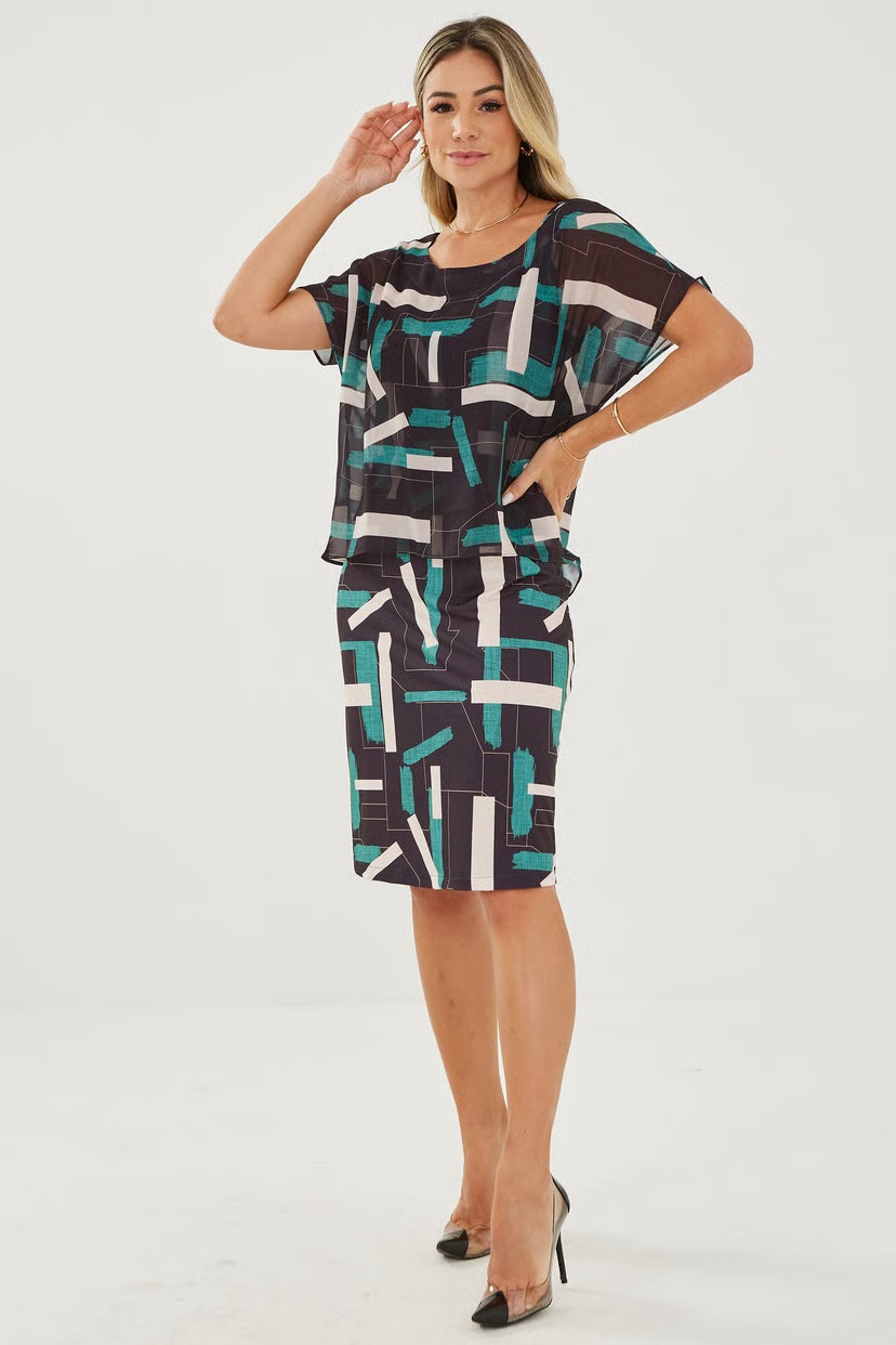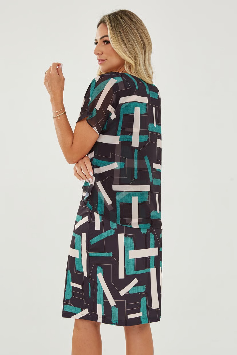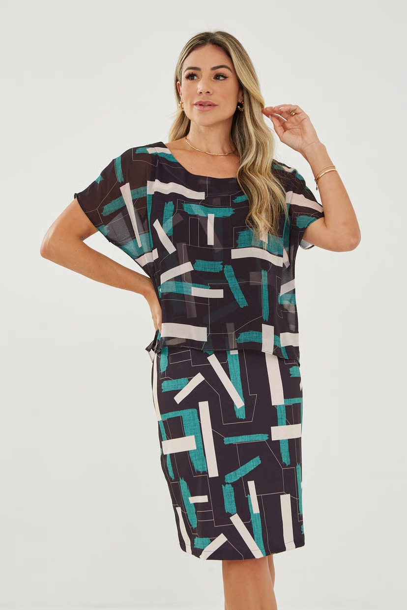 Vestido: Malha (89% poliéster, 11% elastano) / Blusa: Chiffon (100% poliéster)